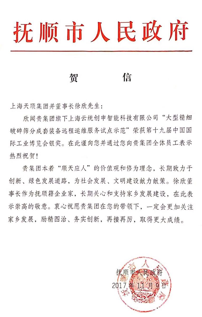 不忘初心 砥礪前行:云統(tǒng)創(chuàng)申獲撫順市人民政府賀信